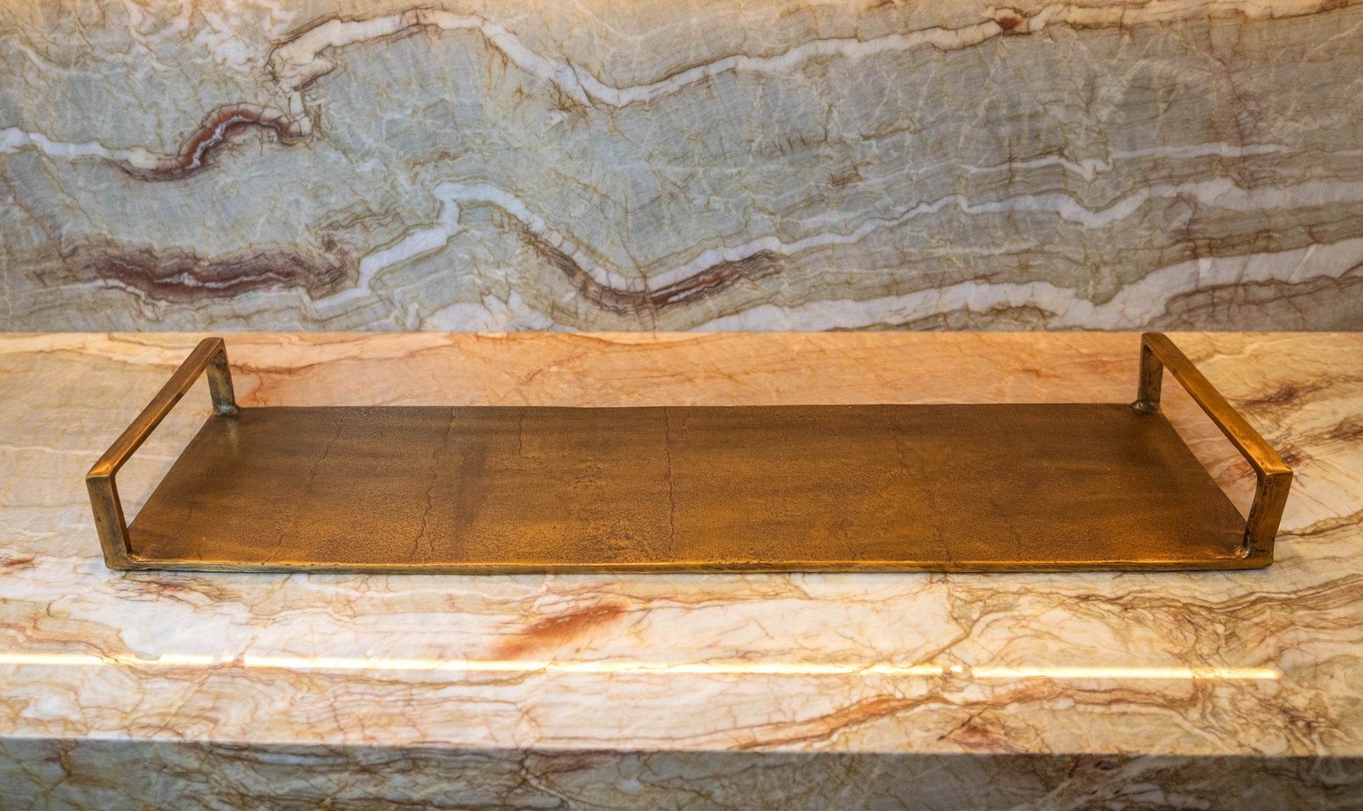 Perfect for serving drinks, appetizers, or desserts, this versatile tray also doubles as a decor piece for coffee tables, consoles, or dining settings. Its clean lines and warm brass tone complement modern, rustic, and traditional interiors alike.