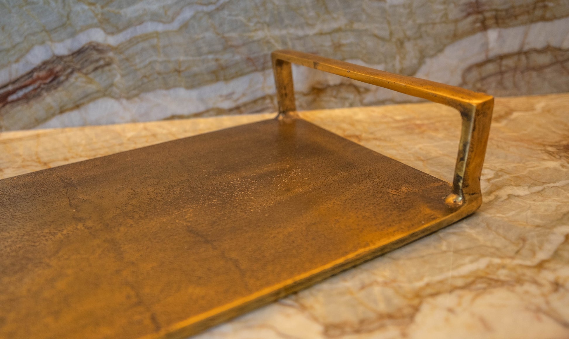 Elevate your hosting experience with this handcrafted rectangular brass serving tray, designed with sleek elevated handles for both style and functionality. Featuring a minimalist design with a smooth, matte brass finish, this tray exudes elegance and timeless charm. Its sturdy structure ensures durability, making it ideal for both serving and display purposes.