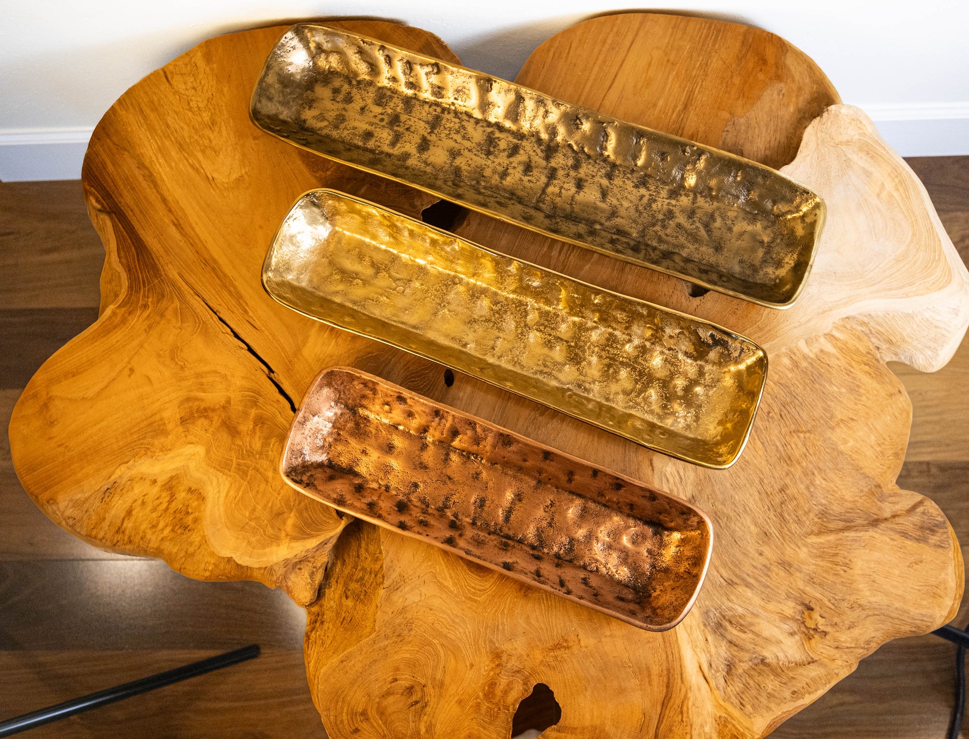 Elevate your dining and decor with this exquisite set of three handcrafted long trays, featuring stunning gold, silver, and copper finishes. Each tray showcases a unique textured surface, bringing an artisanal charm and a touch of sophistication to any setting.