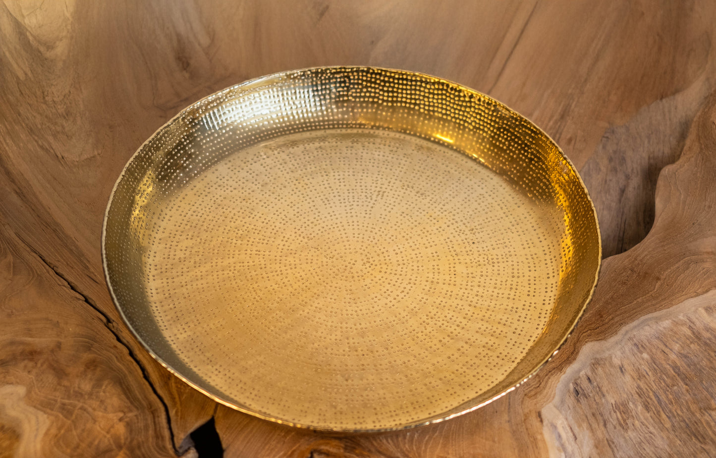 Elevate your decor with this exquisite handcrafted gold finish tray, featuring a meticulously hammered texture that exudes timeless elegance. With its radiant golden finish and detailed craftsmanship, this tray is a versatile addition to any space, offering both functionality and luxury. Its circular design and wide surface make it perfect as a centerpiece, serving tray, or decorative accent.