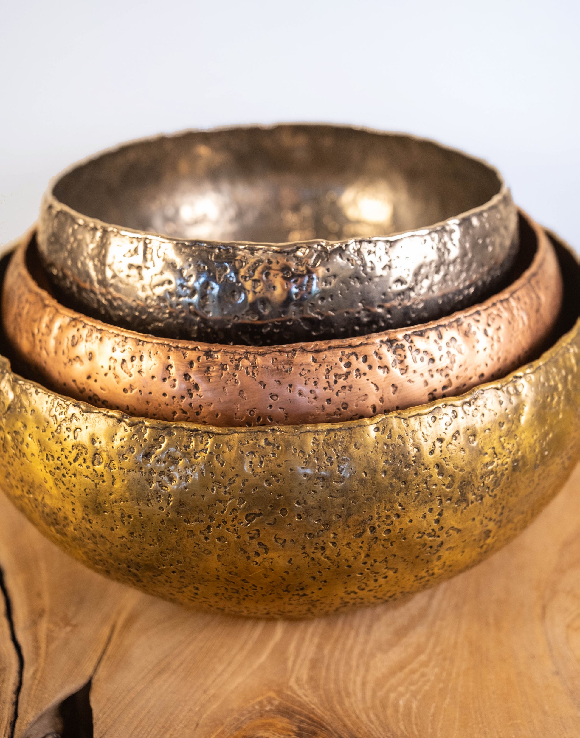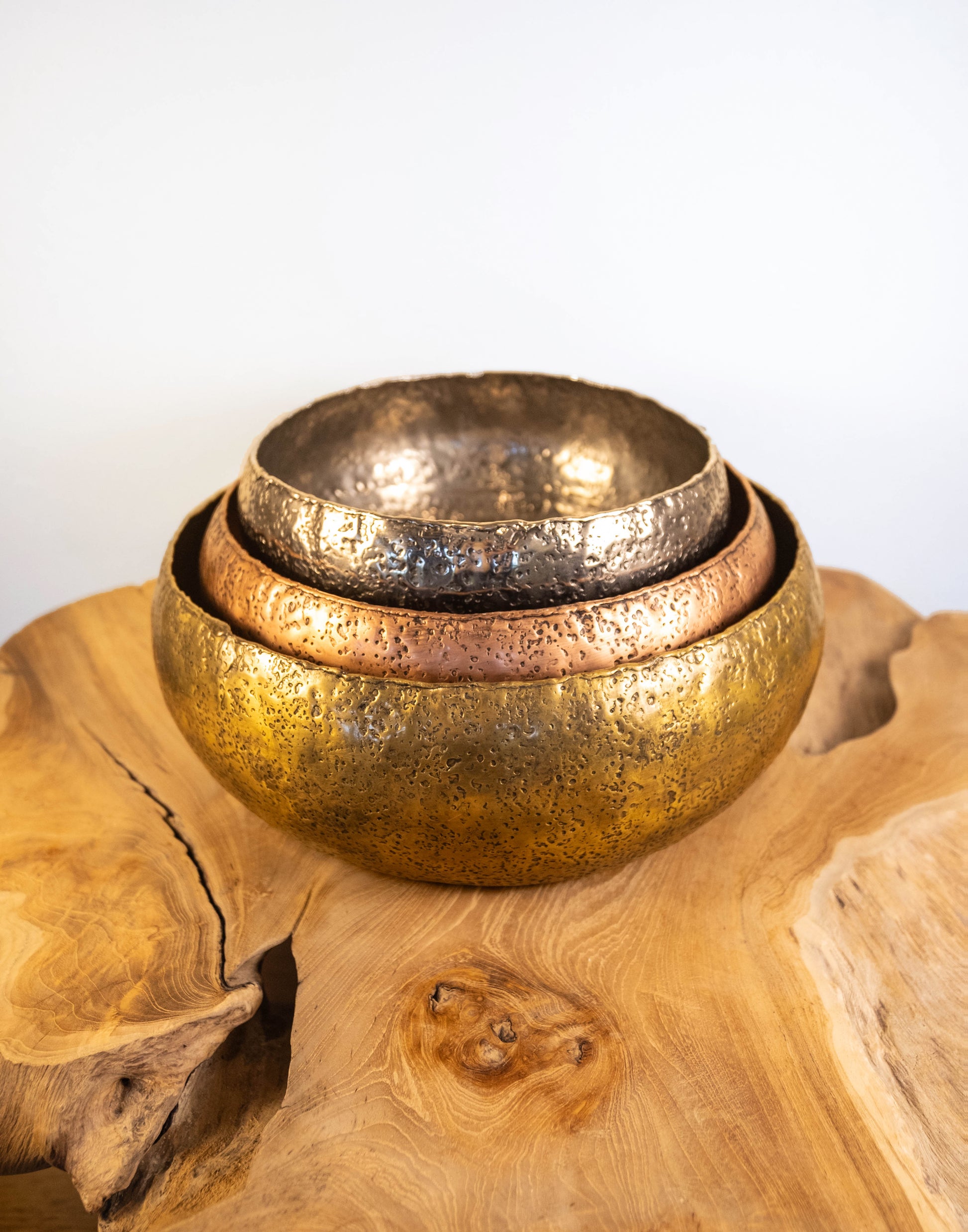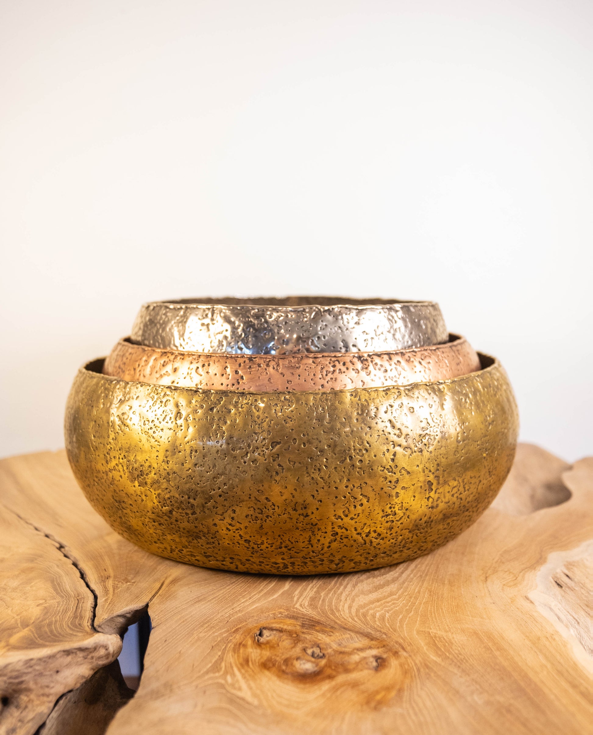 Add a touch of artisanal elegance to your home with this stunning set of handcrafted textured nesting bowls. Featuring three unique finishes—gold, copper, and gunmetal—this versatile set brings together timeless craftsmanship and modern design. Each bowl is beautifully hammered to create a textured surface that reflects light and adds depth and character.