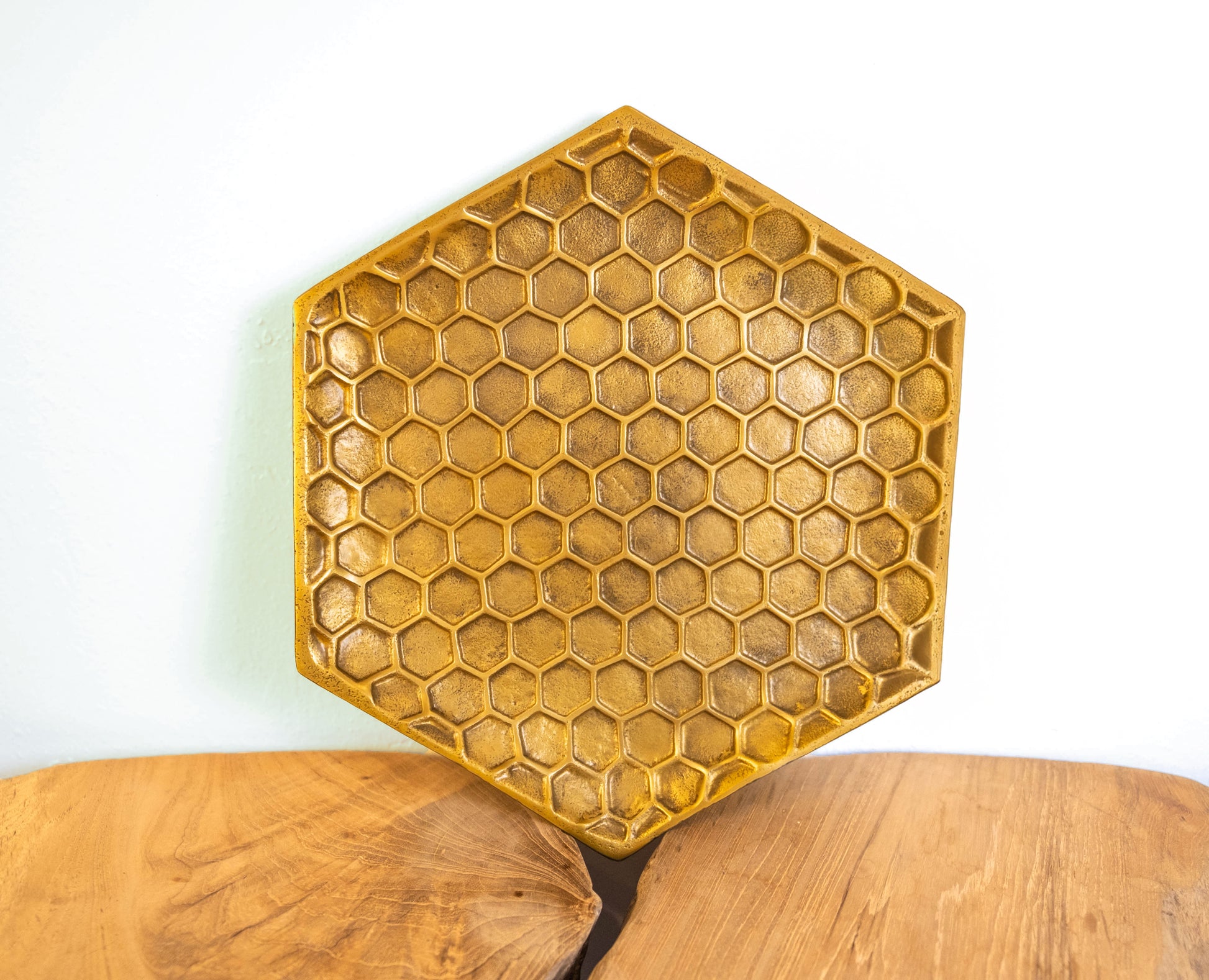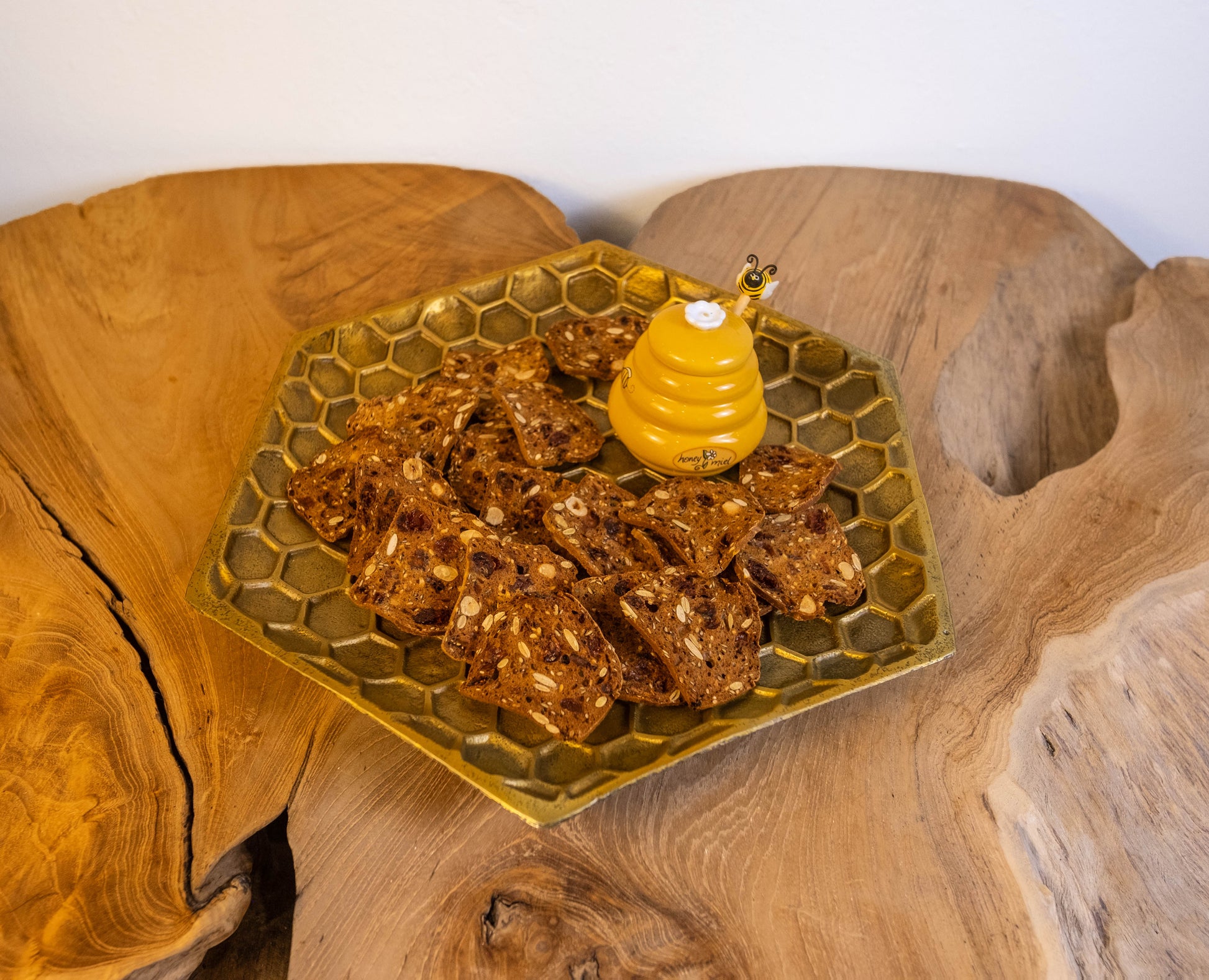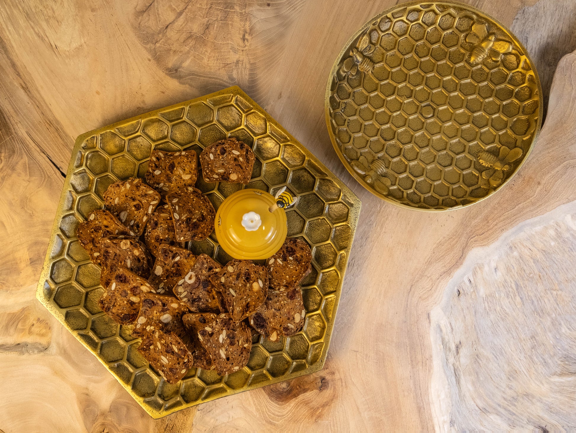 Bring a buzz of elegance to your table with this charming honeycomb-themed tableware set. Crafted with intricate honeycomb detailing, this set includes plates and serving trays perfect for showcasing snacks, desserts, or appetizers. The golden finish adds a luxurious touch, making it ideal for hosting gatherings or creating a stunning centerpiece. Paired with a bee-inspired honey jar and a cute honey dipper, this set is a tribute to nature's sweetness and perfect for eco-conscious décor enthusiasts. Elevate your dining experience with this unique, stylish, and versatile honeycomb tableware collection.