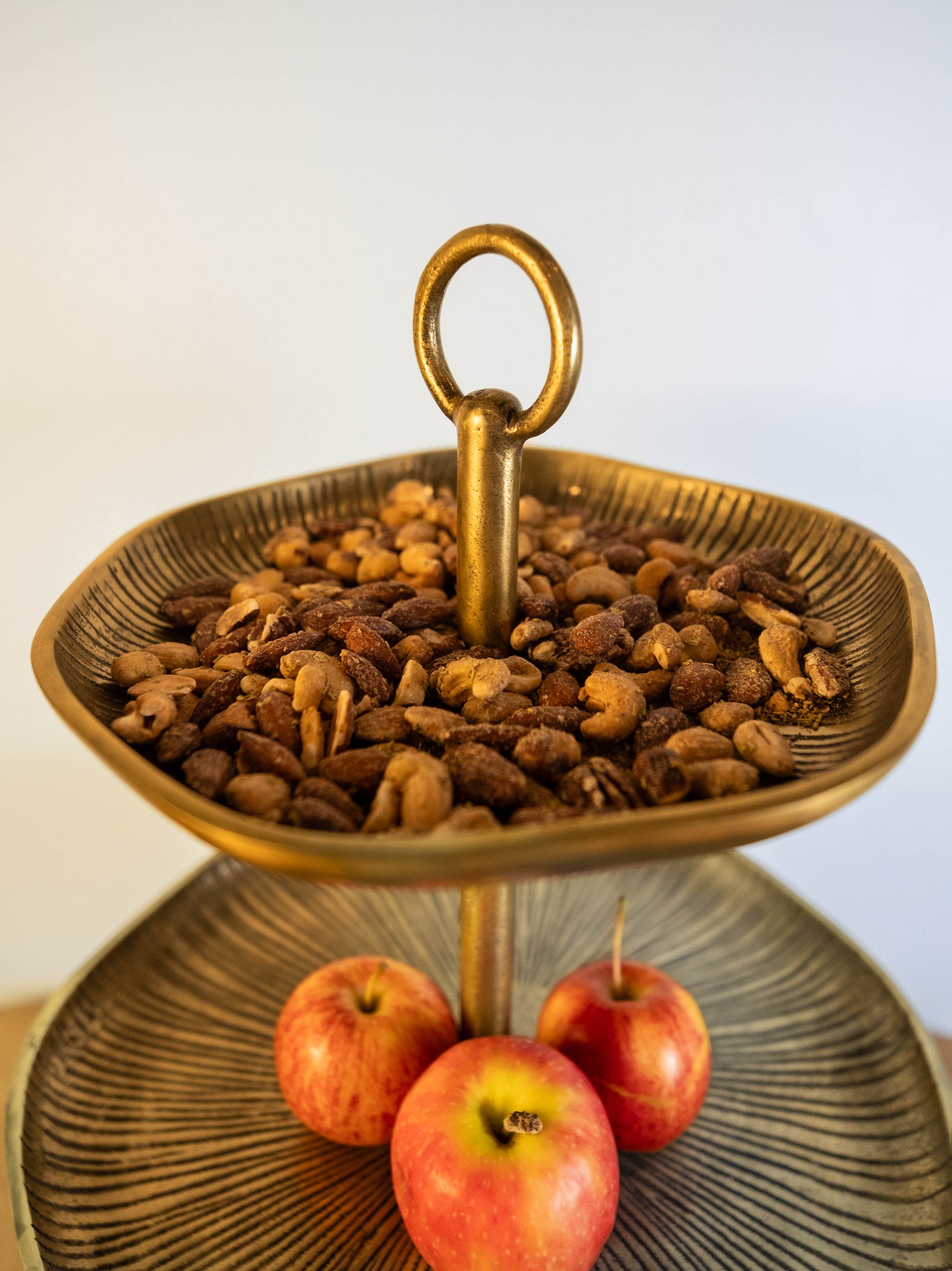 Elevate your entertaining and decor with this exquisite handcrafted antique brass 3-tier serving stand. Featuring a timeless design with intricately textured plates inspired by nature, this stand is both functional and decorative. The sturdy center column and convenient top handle make it easy to transport, while the rich antique brass finish adds a touch of elegance to any setting.