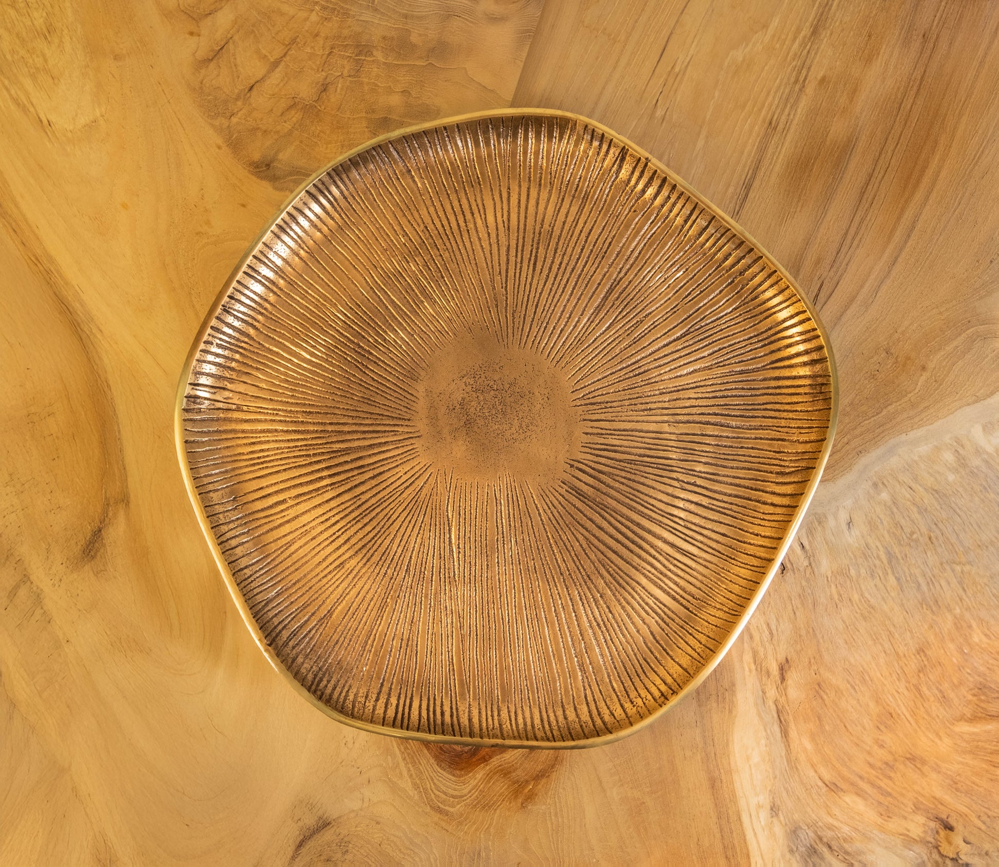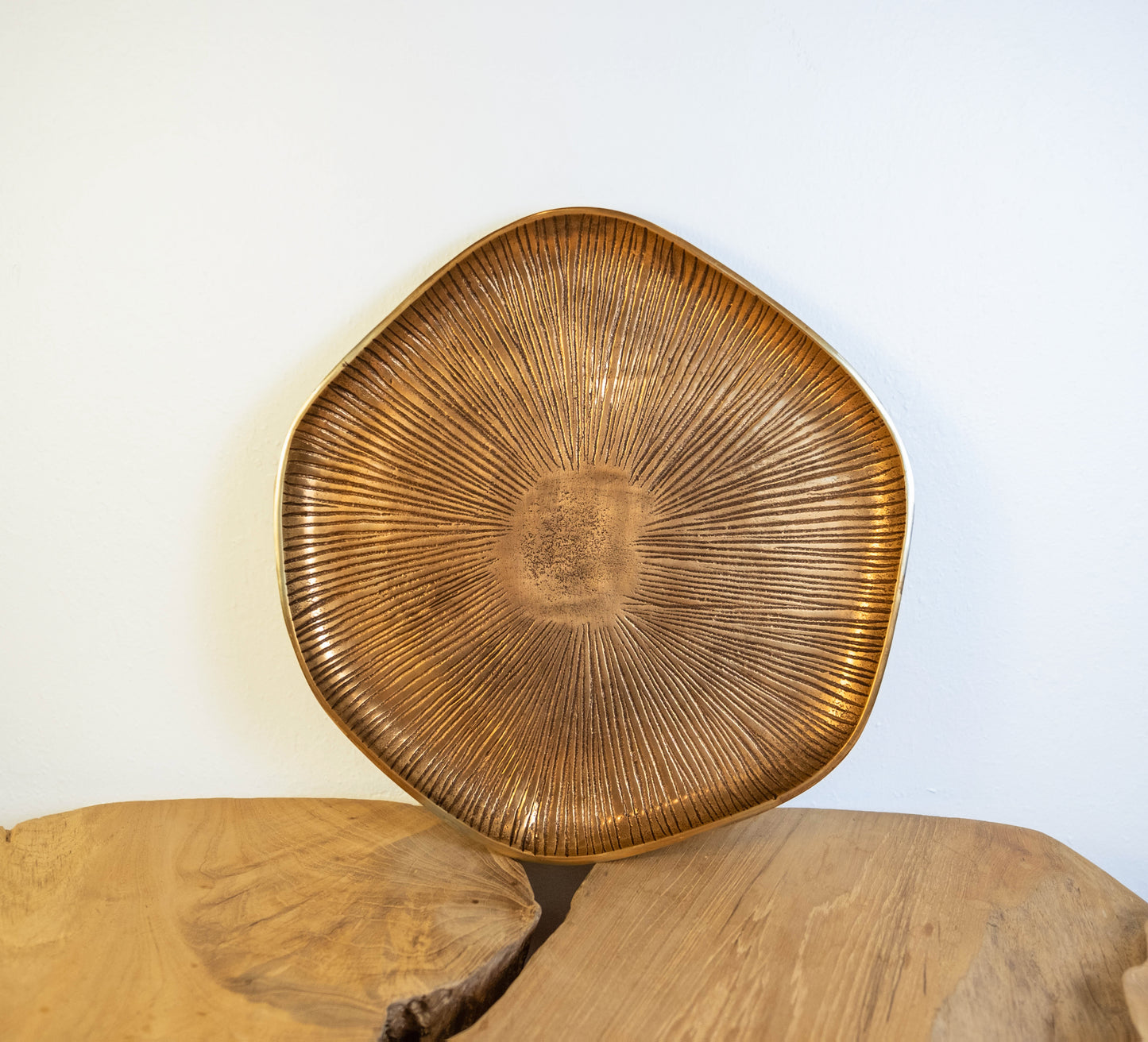 Enhance your home with the understated elegance of this handcrafted gold-plated decorative plate. Featuring a radiant sunburst texture and a soft, organic shape, this piece is a perfect blend of artisanal craftsmanship and contemporary design. The warm gold finish adds a luxurious touch, making it a versatile accent for any decor style.
