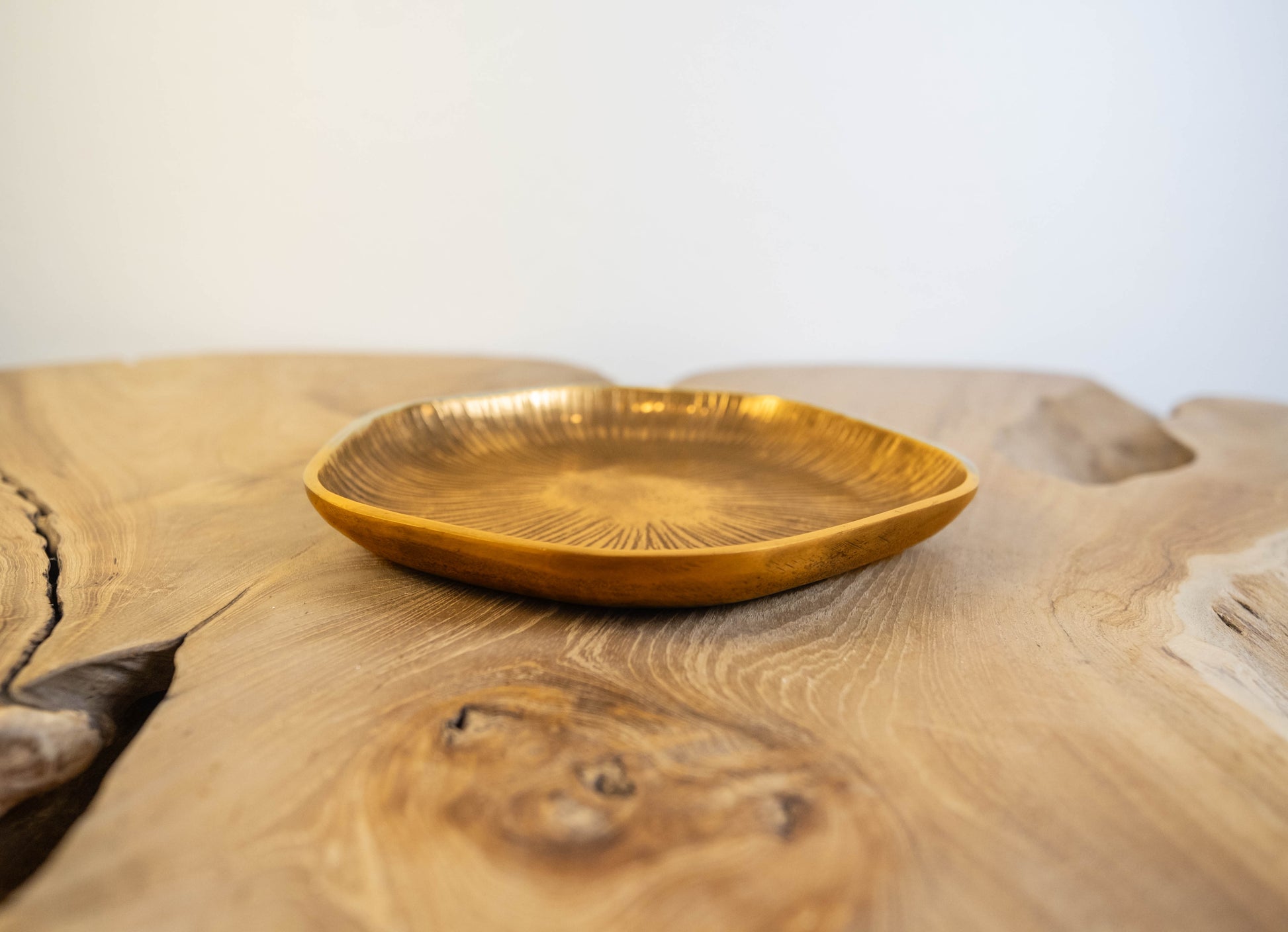 Enhance your home with the understated elegance of this handcrafted gold textured decorative plate. Featuring a radiant sunburst texture and a soft, organic shape, this piece is a perfect blend of artisanal craftsmanship and contemporary design. The warm gold finish adds a luxurious touch, making it a versatile accent for any decor style.